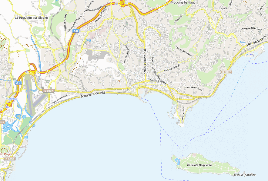 In der direkten Umgebung findet man berühmte Sehenswürdigkeiten wie etwa Notre-Dame-de-l´Espérance, Cannes sowie Tour de Suquet. Häufig aufgerufen sind folgende Karten: Monaco, Grasse, Saint-Tropez und Marseille